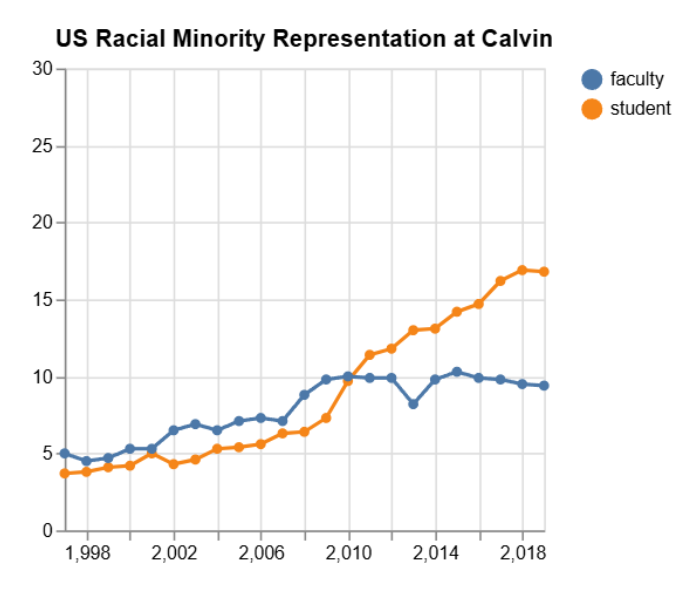 Calvin University is becoming more diverse, with a significant increase in student diversity; however, it hasn’t yet reached the broader US demographic composition.